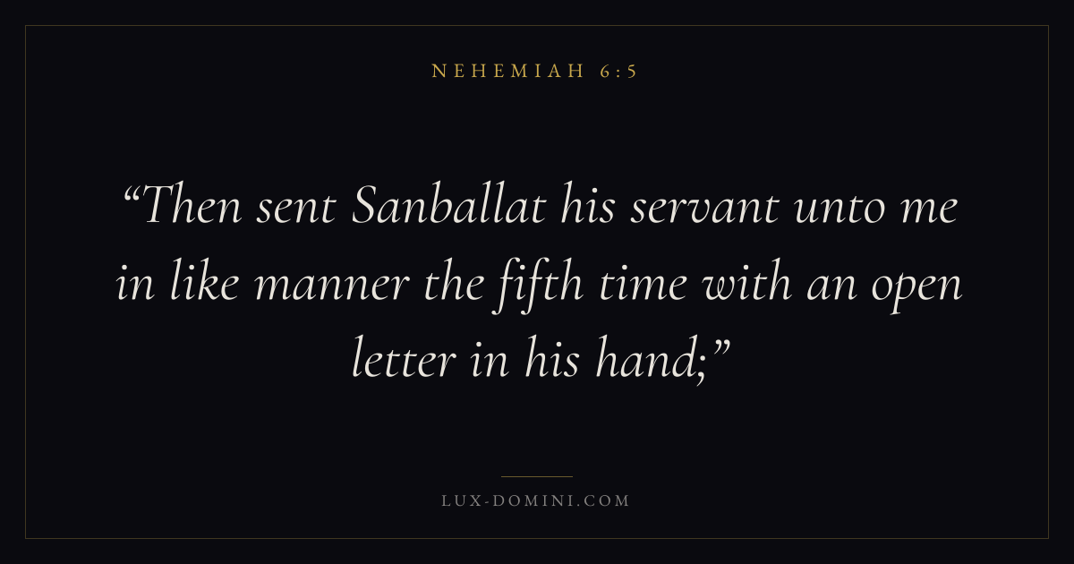 Then sent Sanballat his servant unto me in like manner the fifth time with an open letter in his hand;