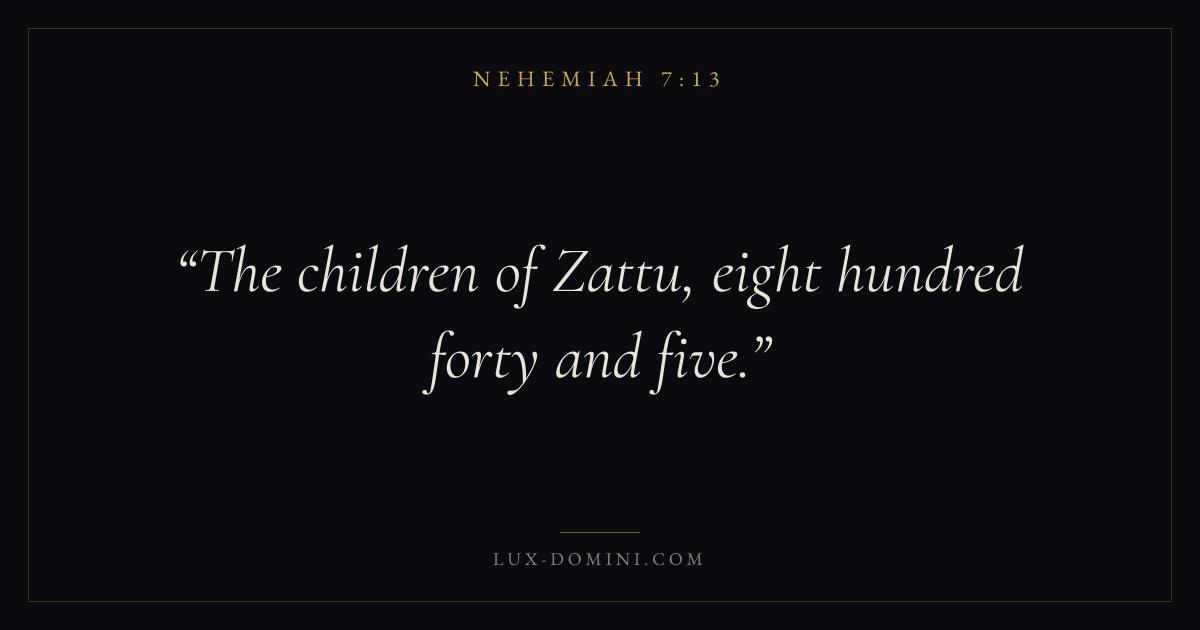 Books / Nehemiah / Chapter 7 / Verse 13 ← Nehemiah 7:12 Nehemiah 7:13 Nehemiah 7:14 → The children of Zattu, eight hundred forty and five. Download verse card Share on Twitter Share on Facebook Pin it ✦ Key themes PrayerGraceRestorationLeadership Read with Nehemiah 7:14Matthew 6:9Luke 18:1Ephesians 2:8 Related topics Bible verses about prayerBible verses about graceBible verses about leadership ✦ Nehemiah Chapter 7 verses V. 1 V. 2 V. 3 V. 4 V. 5 V. 6 V. 7 V. 8 V. 9 V. 10 V. 11 V. 12 V. 13 V. 14 V. 15 V. 16 V. 17 V. 18 V. 19 V. 20 V. 21 V. 22 V. 23 V. 24 V. 25 V. 26 V. 27 V. 28 V. 29 V. 30 V. 31 V. 32 V. 33 V. 34 V. 35 V. 36 V. 37 V. 38 V. 39 V. 40 V. 41 V. 42 V. 43 V. 44 V. 45 V. 46 V. 47 V. 48 V. 49 V. 50 V. 51 V. 52 V. 53 V. 54 V. 55 V. 56 V. 57 V. 58 V. 59 V. 60 V. 61 V. 62 V. 63 V. 64 V. 65 V. 66 V. 67 V. 68 V. 69 V. 70 V. 71 V. 72 V. 73