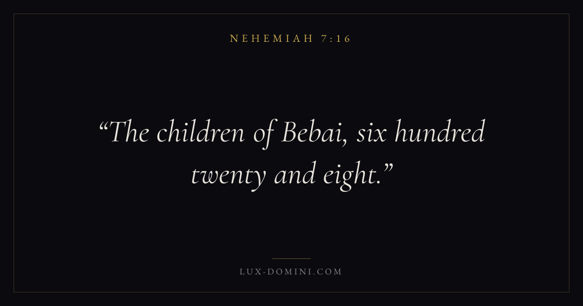 Books / Nehemiah / Chapter 7 / Verse 16 ← Nehemiah 7:15 Nehemiah 7:16 Nehemiah 7:17 → The children of Bebai, six hundred twenty and eight. Download verse card Share on Twitter Share on Facebook Pin it ✦ Key themes PrayerGraceRestorationLeadership Read with Nehemiah 7:15Matthew 6:9Luke 18:1Ephesians 2:8 Related topics Bible verses about prayerBible verses about graceBible verses about leadership ✦ Nehemiah Chapter 7 verses V. 1 V. 2 V. 3 V. 4 V. 5 V. 6 V. 7 V. 8 V. 9 V. 10 V. 11 V. 12 V. 13 V. 14 V. 15 V. 16 V. 17 V. 18 V. 19 V. 20 V. 21 V. 22 V. 23 V. 24 V. 25 V. 26 V. 27 V. 28 V. 29 V. 30 V. 31 V. 32 V. 33 V. 34 V. 35 V. 36 V. 37 V. 38 V. 39 V. 40 V. 41 V. 42 V. 43 V. 44 V. 45 V. 46 V. 47 V. 48 V. 49 V. 50 V. 51 V. 52 V. 53 V. 54 V. 55 V. 56 V. 57 V. 58 V. 59 V. 60 V. 61 V. 62 V. 63 V. 64 V. 65 V. 66 V. 67 V. 68 V. 69 V. 70 V. 71 V. 72 V. 73