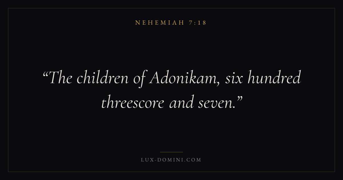 Books / Nehemiah / Chapter 7 / Verse 18 ← Nehemiah 7:17 Nehemiah 7:18 Nehemiah 7:19 → The children of Adonikam, six hundred threescore and seven. Download verse card Share on Twitter Share on Facebook Pin it ✦ Key themes PrayerGraceRestorationLeadership Read with Nehemiah 7:17Matthew 6:9Luke 18:1Ephesians 2:8 Related topics Bible verses about prayerBible verses about graceBible verses about leadership ✦ Nehemiah Chapter 7 verses V. 1 V. 2 V. 3 V. 4 V. 5 V. 6 V. 7 V. 8 V. 9 V. 10 V. 11 V. 12 V. 13 V. 14 V. 15 V. 16 V. 17 V. 18 V. 19 V. 20 V. 21 V. 22 V. 23 V. 24 V. 25 V. 26 V. 27 V. 28 V. 29 V. 30 V. 31 V. 32 V. 33 V. 34 V. 35 V. 36 V. 37 V. 38 V. 39 V. 40 V. 41 V. 42 V. 43 V. 44 V. 45 V. 46 V. 47 V. 48 V. 49 V. 50 V. 51 V. 52 V. 53 V. 54 V. 55 V. 56 V. 57 V. 58 V. 59 V. 60 V. 61 V. 62 V. 63 V. 64 V. 65 V. 66 V. 67 V. 68 V. 69 V. 70 V. 71 V. 72 V. 73