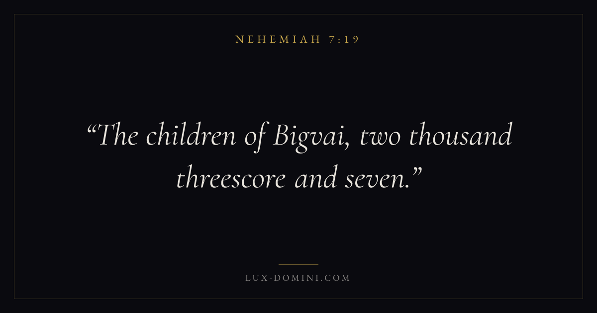 Books / Nehemiah / Chapter 7 / Verse 19 ← Nehemiah 7:18 Nehemiah 7:19 Nehemiah 7:20 → The children of Bigvai, two thousand threescore and seven. Download verse card Share on Twitter Share on Facebook Pin it ✦ Key themes PrayerGraceRestorationLeadership Read with Nehemiah 7:20Matthew 6:9Luke 18:1Ephesians 2:8 Related topics Bible verses about prayerBible verses about graceBible verses about leadership ✦ Nehemiah Chapter 7 verses V. 1 V. 2 V. 3 V. 4 V. 5 V. 6 V. 7 V. 8 V. 9 V. 10 V. 11 V. 12 V. 13 V. 14 V. 15 V. 16 V. 17 V. 18 V. 19 V. 20 V. 21 V. 22 V. 23 V. 24 V. 25 V. 26 V. 27 V. 28 V. 29 V. 30 V. 31 V. 32 V. 33 V. 34 V. 35 V. 36 V. 37 V. 38 V. 39 V. 40 V. 41 V. 42 V. 43 V. 44 V. 45 V. 46 V. 47 V. 48 V. 49 V. 50 V. 51 V. 52 V. 53 V. 54 V. 55 V. 56 V. 57 V. 58 V. 59 V. 60 V. 61 V. 62 V. 63 V. 64 V. 65 V. 66 V. 67 V. 68 V. 69 V. 70 V. 71 V. 72 V. 73