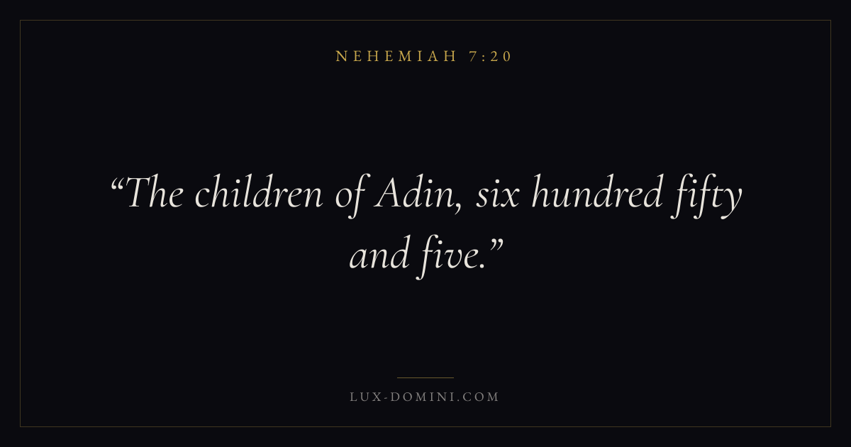 Books / Nehemiah / Chapter 7 / Verse 20 ← Nehemiah 7:19 Nehemiah 7:20 Nehemiah 7:21 → The children of Adin, six hundred fifty and five. Download verse card Share on Twitter Share on Facebook Pin it ✦ Key themes PrayerGraceRestorationLeadership Read with Nehemiah 7:19Matthew 6:9Luke 18:1Ephesians 2:8 Related topics Bible verses about prayerBible verses about graceBible verses about leadership ✦ Nehemiah Chapter 7 verses V. 1 V. 2 V. 3 V. 4 V. 5 V. 6 V. 7 V. 8 V. 9 V. 10 V. 11 V. 12 V. 13 V. 14 V. 15 V. 16 V. 17 V. 18 V. 19 V. 20 V. 21 V. 22 V. 23 V. 24 V. 25 V. 26 V. 27 V. 28 V. 29 V. 30 V. 31 V. 32 V. 33 V. 34 V. 35 V. 36 V. 37 V. 38 V. 39 V. 40 V. 41 V. 42 V. 43 V. 44 V. 45 V. 46 V. 47 V. 48 V. 49 V. 50 V. 51 V. 52 V. 53 V. 54 V. 55 V. 56 V. 57 V. 58 V. 59 V. 60 V. 61 V. 62 V. 63 V. 64 V. 65 V. 66 V. 67 V. 68 V. 69 V. 70 V. 71 V. 72 V. 73
