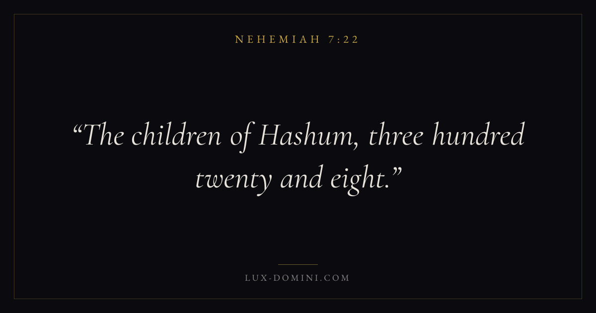 Books / Nehemiah / Chapter 7 / Verse 22 ← Nehemiah 7:21 Nehemiah 7:22 Nehemiah 7:23 → The children of Hashum, three hundred twenty and eight. Download verse card Share on Twitter Share on Facebook Pin it ✦ Key themes PrayerGraceRestorationLeadership Read with Nehemiah 7:21Matthew 6:9Luke 18:1Ephesians 2:8 Related topics Bible verses about prayerBible verses about graceBible verses about leadership ✦ Nehemiah Chapter 7 verses V. 1 V. 2 V. 3 V. 4 V. 5 V. 6 V. 7 V. 8 V. 9 V. 10 V. 11 V. 12 V. 13 V. 14 V. 15 V. 16 V. 17 V. 18 V. 19 V. 20 V. 21 V. 22 V. 23 V. 24 V. 25 V. 26 V. 27 V. 28 V. 29 V. 30 V. 31 V. 32 V. 33 V. 34 V. 35 V. 36 V. 37 V. 38 V. 39 V. 40 V. 41 V. 42 V. 43 V. 44 V. 45 V. 46 V. 47 V. 48 V. 49 V. 50 V. 51 V. 52 V. 53 V. 54 V. 55 V. 56 V. 57 V. 58 V. 59 V. 60 V. 61 V. 62 V. 63 V. 64 V. 65 V. 66 V. 67 V. 68 V. 69 V. 70 V. 71 V. 72 V. 73