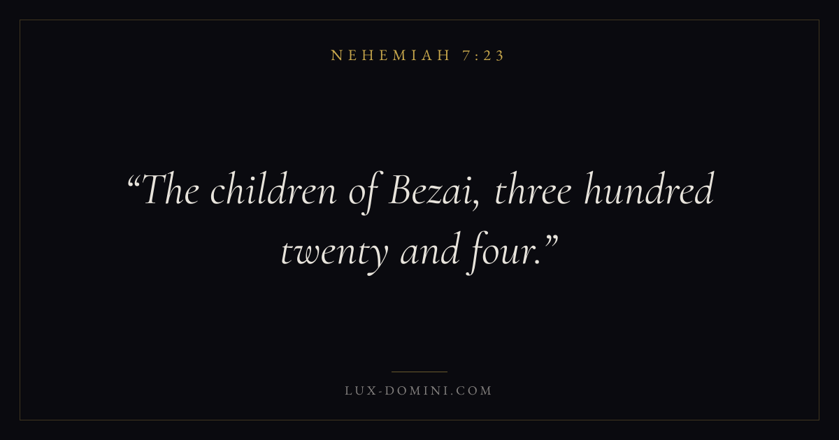 Books / Nehemiah / Chapter 7 / Verse 23 ← Nehemiah 7:22 Nehemiah 7:23 Nehemiah 7:24 → The children of Bezai, three hundred twenty and four. Download verse card Share on Twitter Share on Facebook Pin it ✦ Key themes PrayerGraceRestorationLeadership Read with Nehemiah 7:24Matthew 6:9Luke 18:1Ephesians 2:8 Related topics Bible verses about prayerBible verses about graceBible verses about leadership ✦ Nehemiah Chapter 7 verses V. 1 V. 2 V. 3 V. 4 V. 5 V. 6 V. 7 V. 8 V. 9 V. 10 V. 11 V. 12 V. 13 V. 14 V. 15 V. 16 V. 17 V. 18 V. 19 V. 20 V. 21 V. 22 V. 23 V. 24 V. 25 V. 26 V. 27 V. 28 V. 29 V. 30 V. 31 V. 32 V. 33 V. 34 V. 35 V. 36 V. 37 V. 38 V. 39 V. 40 V. 41 V. 42 V. 43 V. 44 V. 45 V. 46 V. 47 V. 48 V. 49 V. 50 V. 51 V. 52 V. 53 V. 54 V. 55 V. 56 V. 57 V. 58 V. 59 V. 60 V. 61 V. 62 V. 63 V. 64 V. 65 V. 66 V. 67 V. 68 V. 69 V. 70 V. 71 V. 72 V. 73