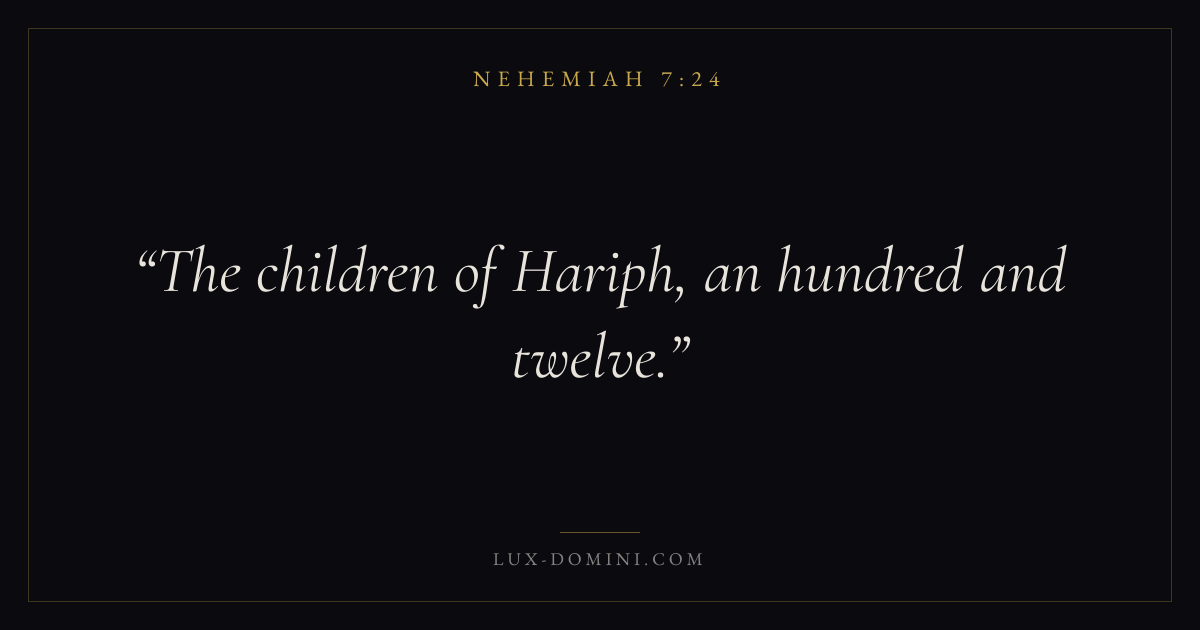 Books / Nehemiah / Chapter 7 / Verse 24 ← Nehemiah 7:23 Nehemiah 7:24 Nehemiah 7:25 → The children of Hariph, an hundred and twelve. Download verse card Share on Twitter Share on Facebook Pin it ✦ Key themes PrayerGraceRestorationLeadership Read with Nehemiah 7:23Matthew 6:9Luke 18:1Ephesians 2:8 Related topics Bible verses about prayerBible verses about graceBible verses about leadership ✦ Nehemiah Chapter 7 verses V. 1 V. 2 V. 3 V. 4 V. 5 V. 6 V. 7 V. 8 V. 9 V. 10 V. 11 V. 12 V. 13 V. 14 V. 15 V. 16 V. 17 V. 18 V. 19 V. 20 V. 21 V. 22 V. 23 V. 24 V. 25 V. 26 V. 27 V. 28 V. 29 V. 30 V. 31 V. 32 V. 33 V. 34 V. 35 V. 36 V. 37 V. 38 V. 39 V. 40 V. 41 V. 42 V. 43 V. 44 V. 45 V. 46 V. 47 V. 48 V. 49 V. 50 V. 51 V. 52 V. 53 V. 54 V. 55 V. 56 V. 57 V. 58 V. 59 V. 60 V. 61 V. 62 V. 63 V. 64 V. 65 V. 66 V. 67 V. 68 V. 69 V. 70 V. 71 V. 72 V. 73