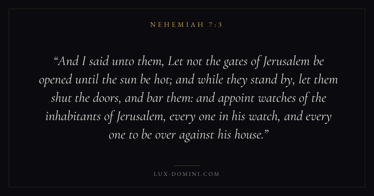 And I said unto them, Let not the gates of Jerusalem be opened until the sun be hot; and while they stand by, let them shut the doors, and bar them: and appoint watches of the inhabitants of Jerusalem, every one in his watch, and every one to be over against his house.