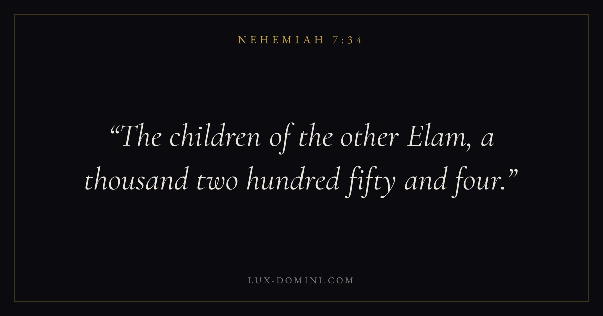 Books / Nehemiah / Chapter 7 / Verse 34 ← Nehemiah 7:33 Nehemiah 7:34 Nehemiah 7:35 → The children of the other Elam, a thousand two hundred fifty and four. Download verse card Share on Twitter Share on Facebook Pin it ✦ Key themes PrayerGraceRestorationLeadership Read with Nehemiah 7:33Matthew 6:9Luke 18:1Ephesians 2:8 Related topics Bible verses about prayerBible verses about graceBible verses about leadership ✦ Nehemiah Chapter 7 verses V. 1 V. 2 V. 3 V. 4 V. 5 V. 6 V. 7 V. 8 V. 9 V. 10 V. 11 V. 12 V. 13 V. 14 V. 15 V. 16 V. 17 V. 18 V. 19 V. 20 V. 21 V. 22 V. 23 V. 24 V. 25 V. 26 V. 27 V. 28 V. 29 V. 30 V. 31 V. 32 V. 33 V. 34 V. 35 V. 36 V. 37 V. 38 V. 39 V. 40 V. 41 V. 42 V. 43 V. 44 V. 45 V. 46 V. 47 V. 48 V. 49 V. 50 V. 51 V. 52 V. 53 V. 54 V. 55 V. 56 V. 57 V. 58 V. 59 V. 60 V. 61 V. 62 V. 63 V. 64 V. 65 V. 66 V. 67 V. 68 V. 69 V. 70 V. 71 V. 72 V. 73