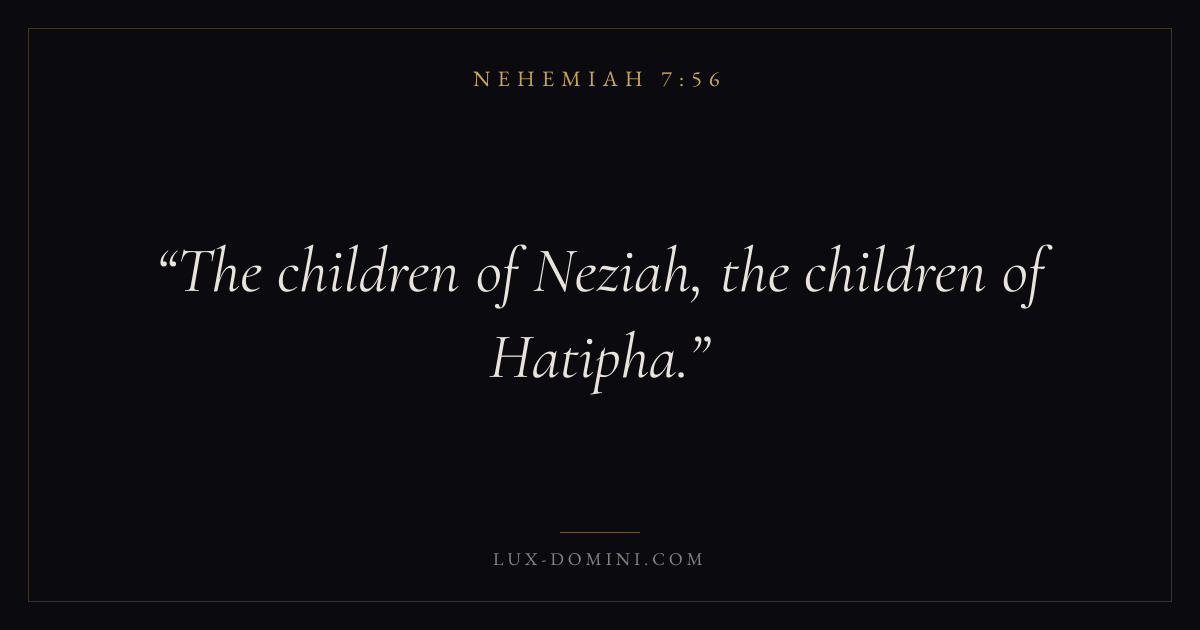 Books / Nehemiah / Chapter 7 / Verse 56 ← Nehemiah 7:55 Nehemiah 7:56 Nehemiah 7:57 → The children of Neziah, the children of Hatipha. Download verse card Share on Twitter Share on Facebook Pin it ✦ Key themes PrayerGraceRestorationLeadership Read with Matthew 6:9Luke 18:1Ephesians 2:82 Corinthians 12:9 Related topics Bible verses about prayerBible verses about graceBible verses about leadership ✦ Nehemiah Chapter 7 verses V. 1 V. 2 V. 3 V. 4 V. 5 V. 6 V. 7 V. 8 V. 9 V. 10 V. 11 V. 12 V. 13 V. 14 V. 15 V. 16 V. 17 V. 18 V. 19 V. 20 V. 21 V. 22 V. 23 V. 24 V. 25 V. 26 V. 27 V. 28 V. 29 V. 30 V. 31 V. 32 V. 33 V. 34 V. 35 V. 36 V. 37 V. 38 V. 39 V. 40 V. 41 V. 42 V. 43 V. 44 V. 45 V. 46 V. 47 V. 48 V. 49 V. 50 V. 51 V. 52 V. 53 V. 54 V. 55 V. 56 V. 57 V. 58 V. 59 V. 60 V. 61 V. 62 V. 63 V. 64 V. 65 V. 66 V. 67 V. 68 V. 69 V. 70 V. 71 V. 72 V. 73