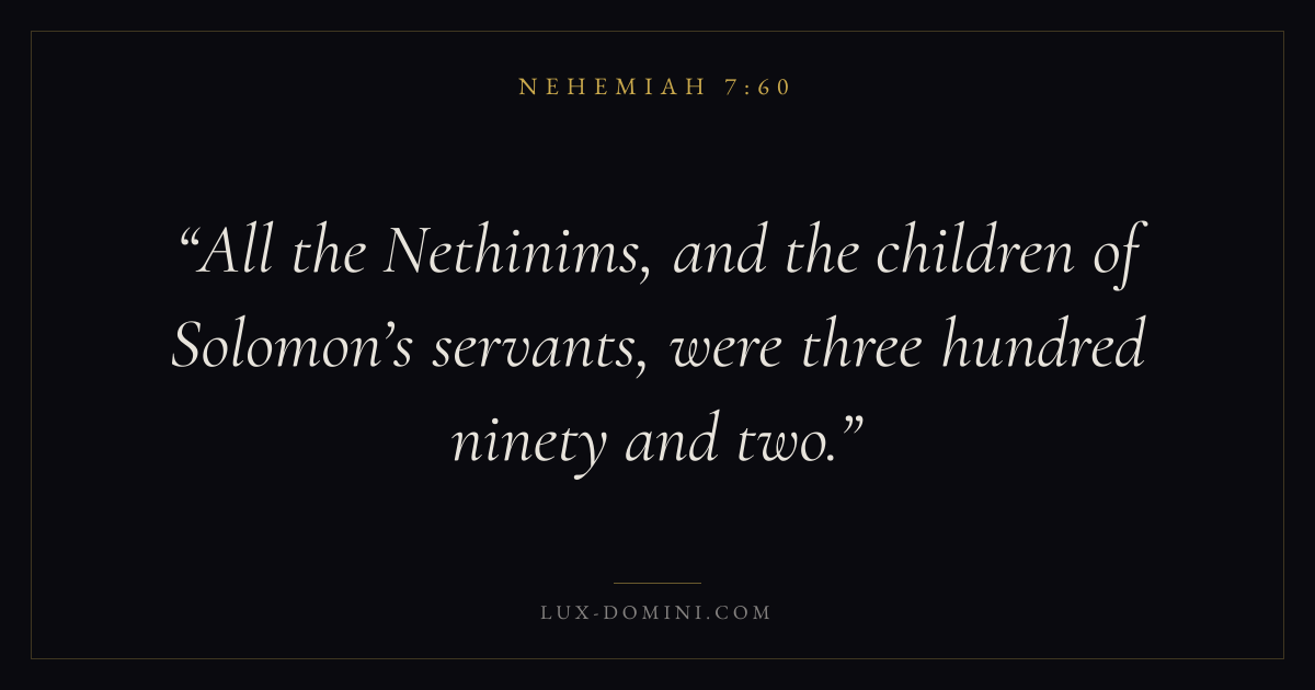Books / Nehemiah / Chapter 7 / Verse 60 ← Nehemiah 7:59 Nehemiah 7:60 Nehemiah 7:61 → All the Nethinims, and the children of Solomon’s servants, were three hundred ninety and two. Download verse card Share on Twitter Share on Facebook Pin it ✦ Key themes PrayerGraceRestorationLeadership Read with Nehemiah 7:61Nehemiah 7:62Matthew 6:9Luke 18:1 Related topics Bible verses about prayerBible verses about graceBible verses about leadership ✦ Nehemiah Chapter 7 verses V. 1 V. 2 V. 3 V. 4 V. 5 V. 6 V. 7 V. 8 V. 9 V. 10 V. 11 V. 12 V. 13 V. 14 V. 15 V. 16 V. 17 V. 18 V. 19 V. 20 V. 21 V. 22 V. 23 V. 24 V. 25 V. 26 V. 27 V. 28 V. 29 V. 30 V. 31 V. 32 V. 33 V. 34 V. 35 V. 36 V. 37 V. 38 V. 39 V. 40 V. 41 V. 42 V. 43 V. 44 V. 45 V. 46 V. 47 V. 48 V. 49 V. 50 V. 51 V. 52 V. 53 V. 54 V. 55 V. 56 V. 57 V. 58 V. 59 V. 60 V. 61 V. 62 V. 63 V. 64 V. 65 V. 66 V. 67 V. 68 V. 69 V. 70 V. 71 V. 72 V. 73