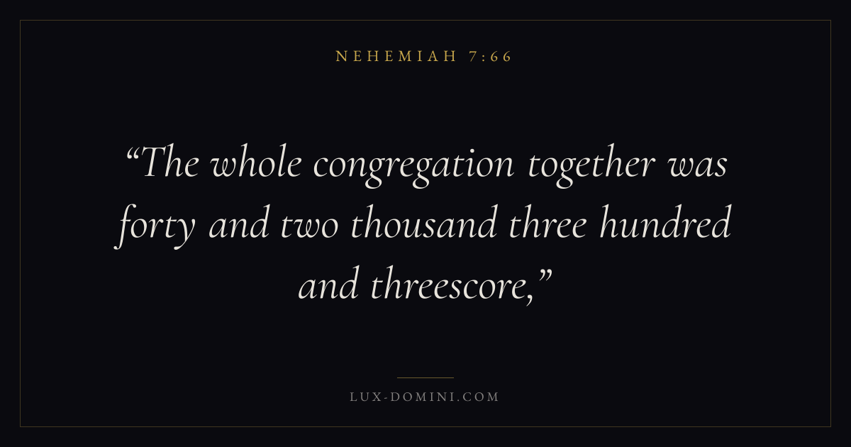 Books / Nehemiah / Chapter 7 / Verse 66 ← Nehemiah 7:65 Nehemiah 7:66 Nehemiah 7:67 → The whole congregation together was forty and two thousand three hundred and threescore, Download verse card Share on Twitter Share on Facebook Pin it ✦ Key themes PrayerGraceRestorationLeadership Read with Nehemiah 7:67Nehemiah 7:68Matthew 6:9Luke 18:1 Related topics Bible verses about prayerBible verses about graceBible verses about leadership ✦ Nehemiah Chapter 7 verses V. 1 V. 2 V. 3 V. 4 V. 5 V. 6 V. 7 V. 8 V. 9 V. 10 V. 11 V. 12 V. 13 V. 14 V. 15 V. 16 V. 17 V. 18 V. 19 V. 20 V. 21 V. 22 V. 23 V. 24 V. 25 V. 26 V. 27 V. 28 V. 29 V. 30 V. 31 V. 32 V. 33 V. 34 V. 35 V. 36 V. 37 V. 38 V. 39 V. 40 V. 41 V. 42 V. 43 V. 44 V. 45 V. 46 V. 47 V. 48 V. 49 V. 50 V. 51 V. 52 V. 53 V. 54 V. 55 V. 56 V. 57 V. 58 V. 59 V. 60 V. 61 V. 62 V. 63 V. 64 V. 65 V. 66 V. 67 V. 68 V. 69 V. 70 V. 71 V. 72 V. 73