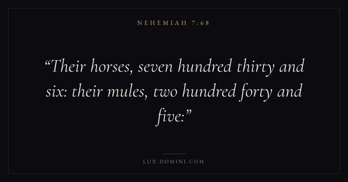 Books / Nehemiah / Chapter 7 / Verse 68 ← Nehemiah 7:67 Nehemiah 7:68 Nehemiah 7:69 → Their horses, seven hundred thirty and six: their mules, two hundred forty and five: Download verse card Share on Twitter Share on Facebook Pin it ✦ Key themes PrayerGraceRestorationLeadership Read with Nehemiah 7:66Nehemiah 7:67Matthew 6:9Luke 18:1 Related topics Bible verses about prayerBible verses about graceBible verses about leadership ✦ Nehemiah Chapter 7 verses V. 1 V. 2 V. 3 V. 4 V. 5 V. 6 V. 7 V. 8 V. 9 V. 10 V. 11 V. 12 V. 13 V. 14 V. 15 V. 16 V. 17 V. 18 V. 19 V. 20 V. 21 V. 22 V. 23 V. 24 V. 25 V. 26 V. 27 V. 28 V. 29 V. 30 V. 31 V. 32 V. 33 V. 34 V. 35 V. 36 V. 37 V. 38 V. 39 V. 40 V. 41 V. 42 V. 43 V. 44 V. 45 V. 46 V. 47 V. 48 V. 49 V. 50 V. 51 V. 52 V. 53 V. 54 V. 55 V. 56 V. 57 V. 58 V. 59 V. 60 V. 61 V. 62 V. 63 V. 64 V. 65 V. 66 V. 67 V. 68 V. 69 V. 70 V. 71 V. 72 V. 73