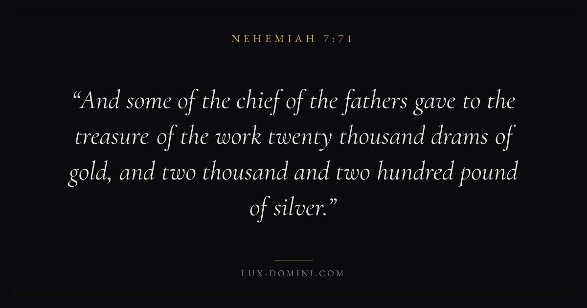 And some of the chief of the fathers gave to the treasure of the work twenty thousand drams of gold, and two thousand and two hundred pound of silver.