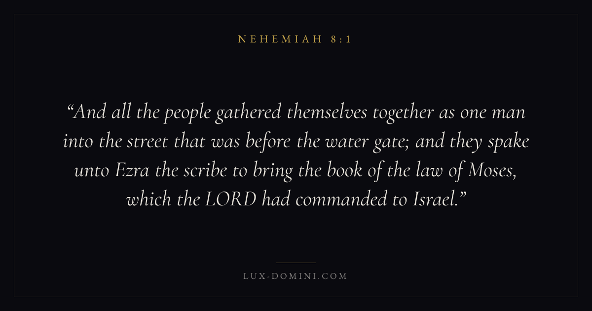 And all the people gathered themselves together as one man into the street that was before the water gate; and they spake unto Ezra the scribe to bring the book of the law of Moses, which the LORD had commanded to Israel.