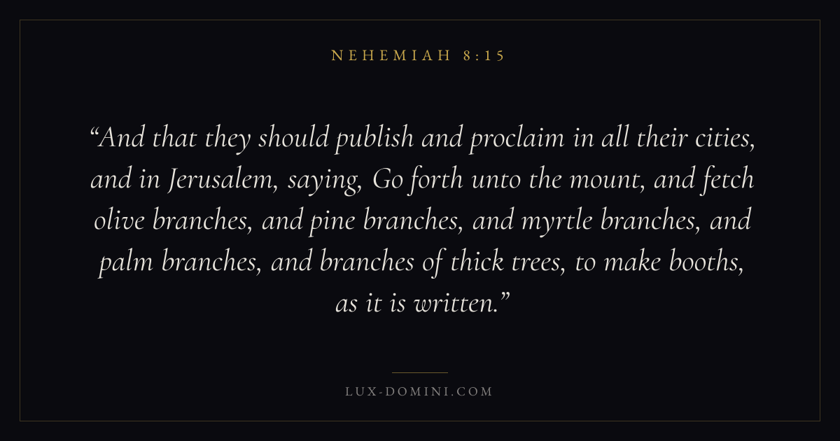 And that they should publish and proclaim in all their cities, and in Jerusalem, saying, Go forth unto the mount, and fetch olive branches, and pine branches, and myrtle branches, and palm branches, and branches of thick trees, to make booths, as it is written.