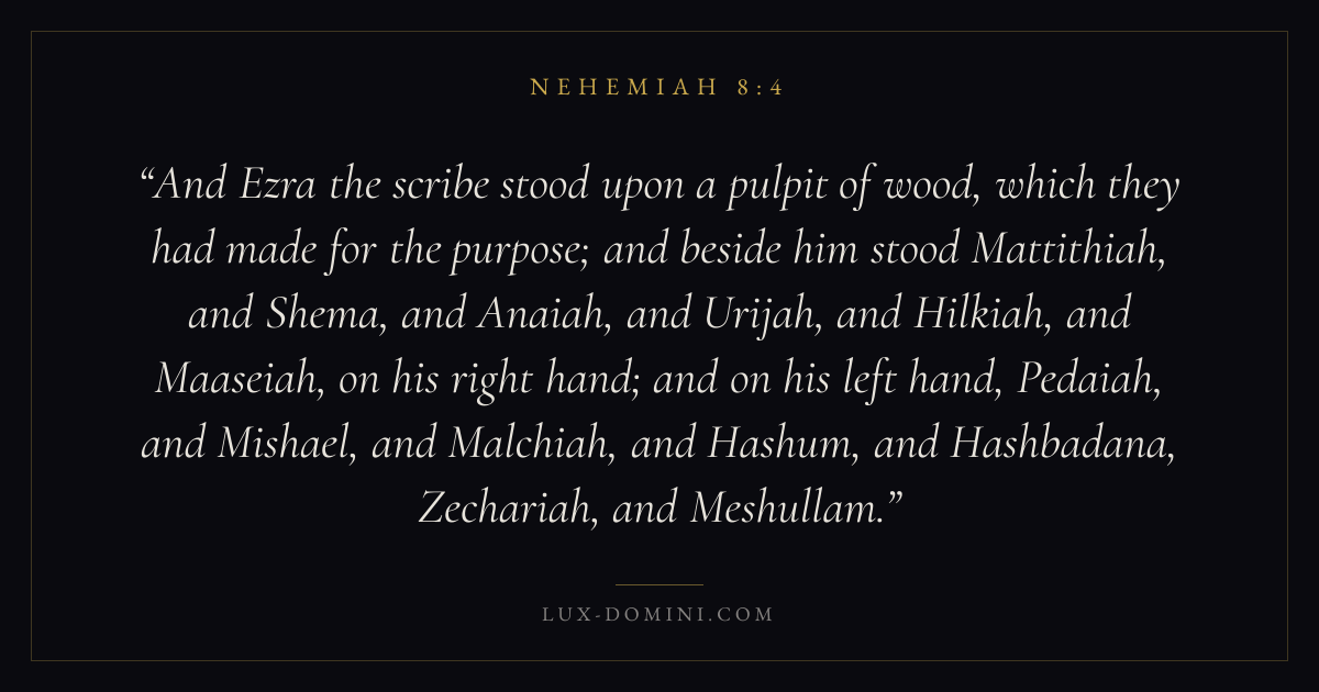 And Ezra the scribe stood upon a pulpit of wood, which they had made for the purpose; and beside him stood Mattithiah, and Shema, and Anaiah, and Urijah, and Hilkiah, and Maaseiah, on his right hand; and on his left hand, Pedaiah, and Mishael, and Malchiah, and Hashum, and Hashbadana, Zechariah, and Meshullam.