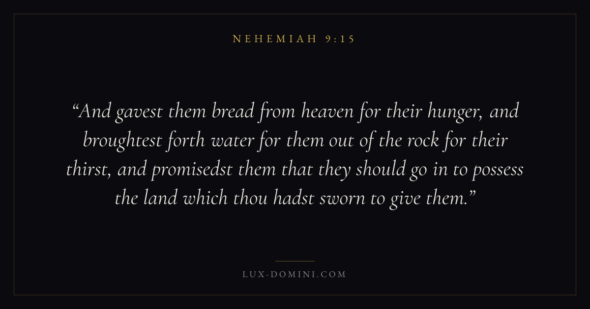 And gavest them bread from heaven for their hunger, and broughtest forth water for them out of the rock for their thirst, and promisedst them that they should go in to possess the land which thou hadst sworn to give them.