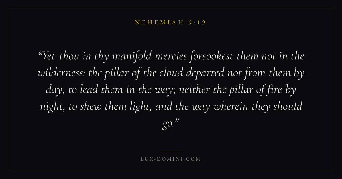 Yet thou in thy manifold mercies forsookest them not in the wilderness: the pillar of the cloud departed not from them by day, to lead them in the way; neither the pillar of fire by night, to shew them light, and the way wherein they should go.