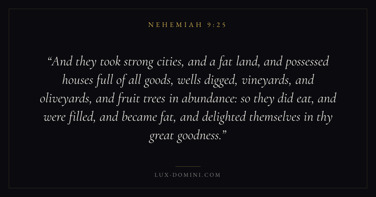 And they took strong cities, and a fat land, and possessed houses full of all goods, wells digged, vineyards, and oliveyards, and fruit trees in abundance: so they did eat, and were filled, and became fat, and delighted themselves in thy great goodness.