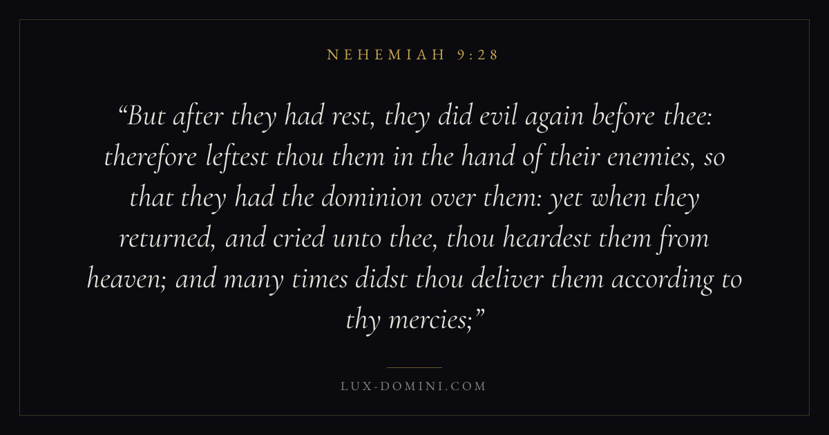 But after they had rest, they did evil again before thee: therefore leftest thou them in the hand of their enemies, so that they had the dominion over them: yet when they returned, and cried unto thee, thou heardest them from heaven; and many times didst thou deliver them according to thy mercies;
