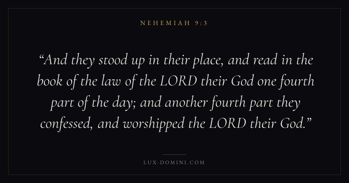And they stood up in their place, and read in the book of the law of the LORD their God one fourth part of the day; and another fourth part they confessed, and worshipped the LORD their God.