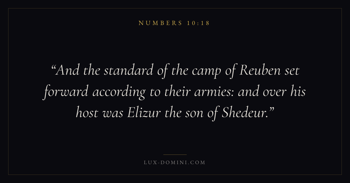 And the standard of the camp of Reuben set forward according to their armies: and over his host was Elizur the son of Shedeur.