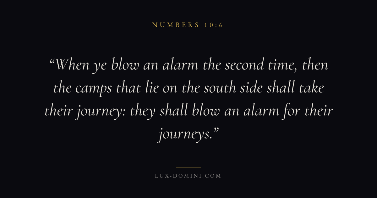 When ye blow an alarm the second time, then the camps that lie on the south side shall take their journey: they shall blow an alarm for their journeys.