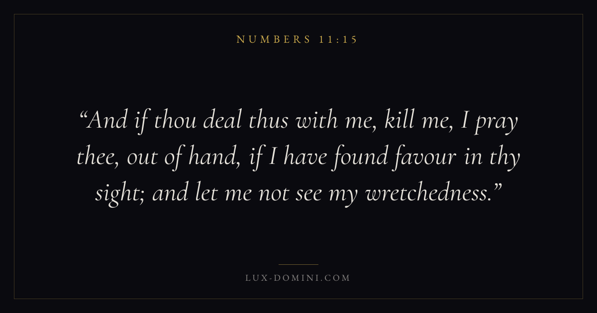 And if thou deal thus with me, kill me, I pray thee, out of hand, if I have found favour in thy sight; and let me not see my wretchedness.