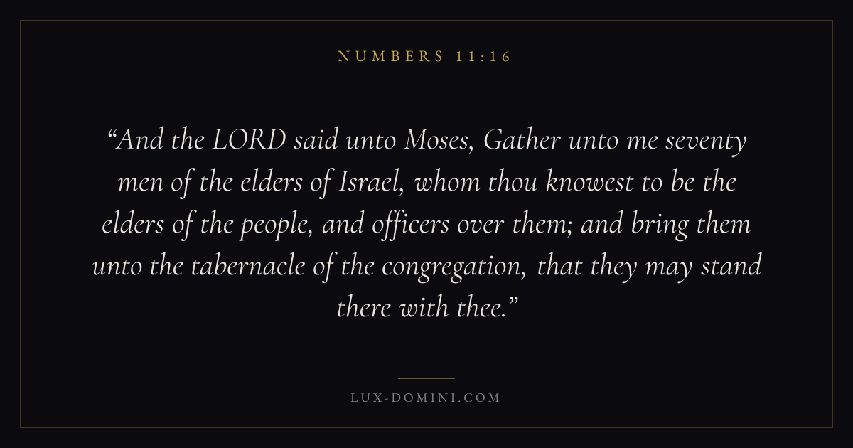 And the LORD said unto Moses, Gather unto me seventy men of the elders of Israel, whom thou knowest to be the elders of the people, and officers over them; and bring them unto the tabernacle of the congregation, that they may stand there with thee.