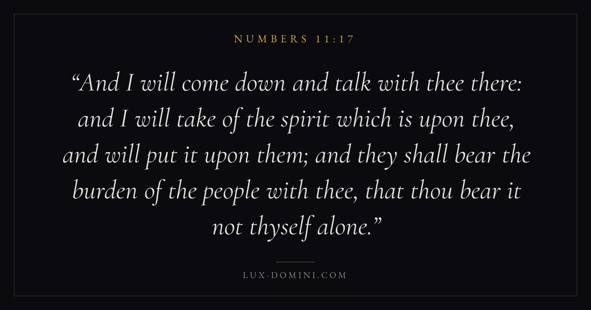 And I will come down and talk with thee there: and I will take of the spirit which is upon thee, and will put it upon them; and they shall bear the burden of the people with thee, that thou bear it not thyself alone.