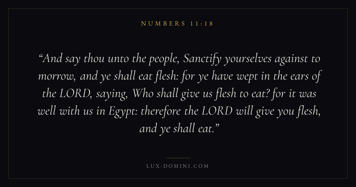 And say thou unto the people, Sanctify yourselves against to morrow, and ye shall eat flesh: for ye have wept in the ears of the LORD, saying, Who shall give us flesh to eat? for it was well with us in Egypt: therefore the LORD will give you flesh, and ye shall eat.