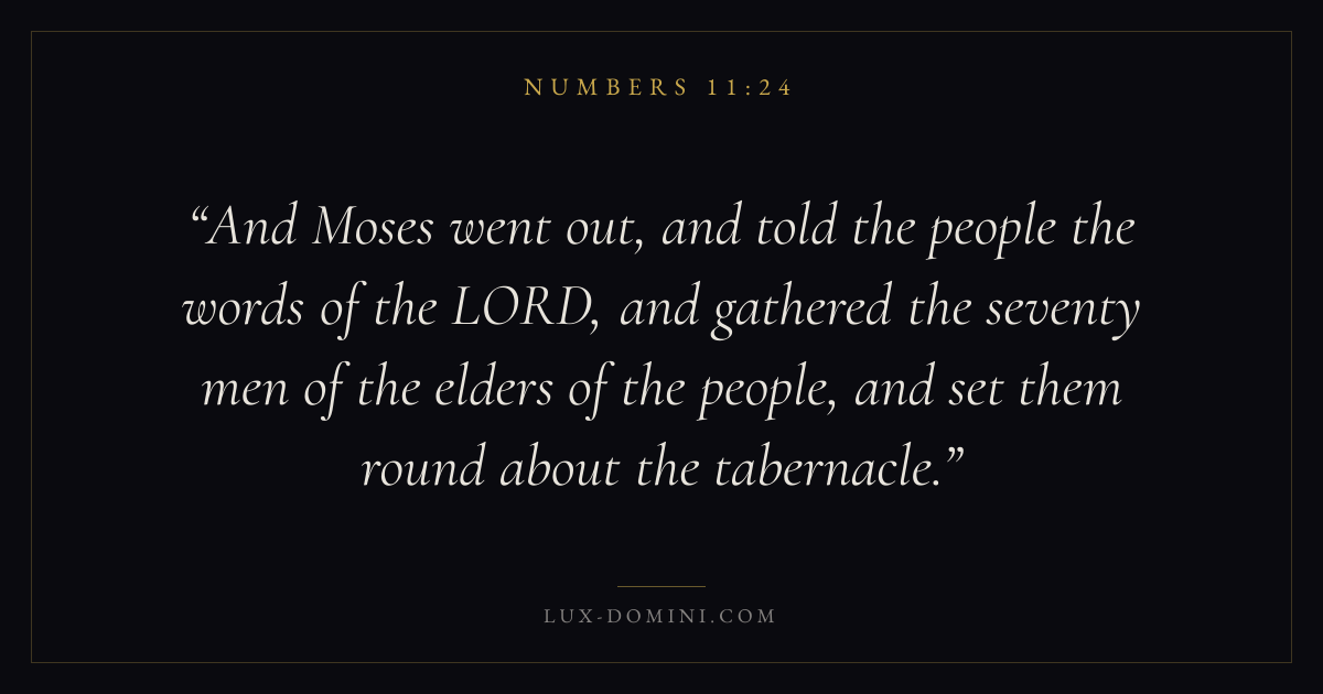 And Moses went out, and told the people the words of the LORD, and gathered the seventy men of the elders of the people, and set them round about the tabernacle.