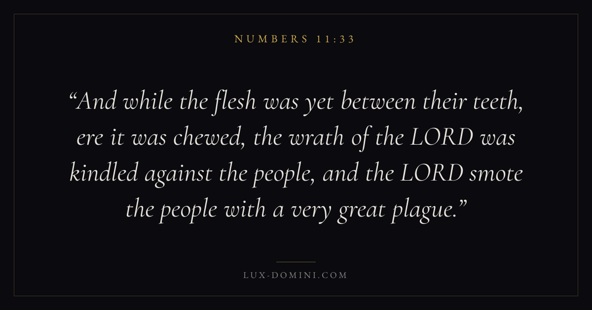 And while the flesh was yet between their teeth, ere it was chewed, the wrath of the LORD was kindled against the people, and the LORD smote the people with a very great plague.