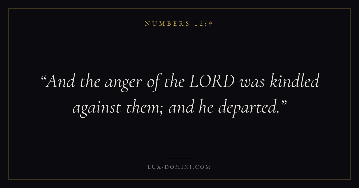 Books / Numbers / Chapter 12 / Verse 9 ← Numbers 12:8 Numbers 12:9 Numbers 12:10 → And the anger of the LORD was kindled against them; and he departed. Download verse card Share on Twitter Share on Facebook Pin it ✦ Key themes Justice and mercyHumilityPilgrimageRebellion Read with Numbers 12:7Numbers 12:8Micah 6:8Amos 5:24 Related topics Bible verses about justice and mercyBible verses about humility ✦ Numbers Chapter 12 verses V. 1 V. 2 V. 3 V. 4 V. 5 V. 6 V. 7 V. 8 V. 9 V. 10 V. 11 V. 12 V. 13 V. 14 V. 15 V. 16