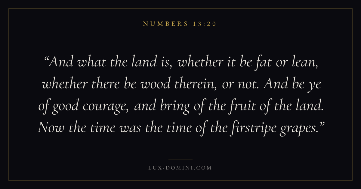 And what the land is, whether it be fat or lean, whether there be wood therein, or not. And be ye of good courage, and bring of the fruit of the land. Now the time was the time of the firstripe grapes.