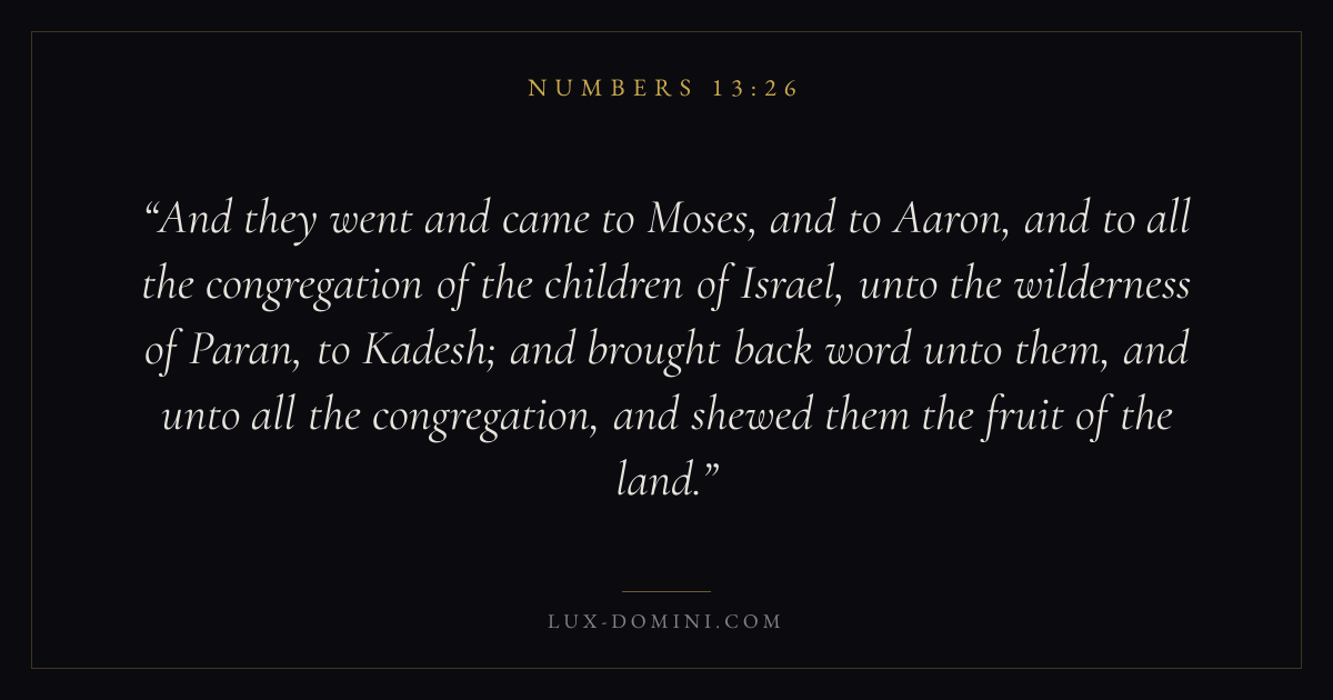 And they went and came to Moses, and to Aaron, and to all the congregation of the children of Israel, unto the wilderness of Paran, to Kadesh; and brought back word unto them, and unto all the congregation, and shewed them the fruit of the land.