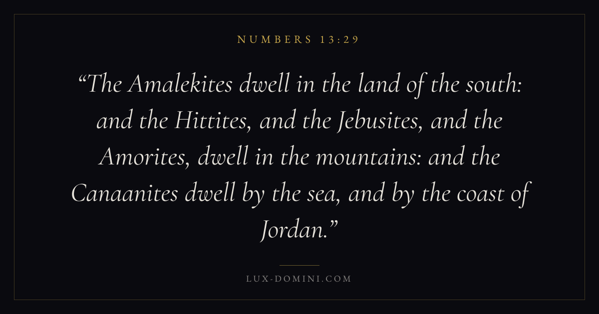 The Amalekites dwell in the land of the south: and the Hittites, and the Jebusites, and the Amorites, dwell in the mountains: and the Canaanites dwell by the sea, and by the coast of Jordan.