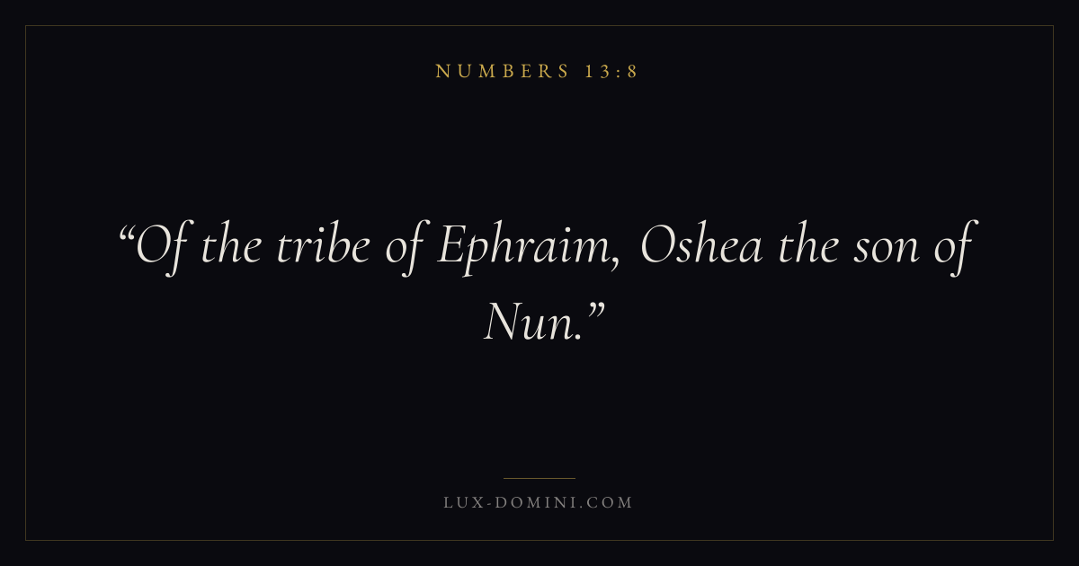 Books / Numbers / Chapter 13 / Verse 8 ← Numbers 13:7 Numbers 13:8 Numbers 13:9 → Of the tribe of Ephraim, Oshea the son of Nun. Download verse card Share on Twitter Share on Facebook Pin it ✦ Key themes Justice and mercyPilgrimageRebellionJudgment Read with Numbers 13:7Micah 6:8Amos 5:24 Related topics Bible verses about justice and mercy Glossary Nun Person Beyond the fact that he was the father of Joshua nothing more is known of him ( Ex. 33:11 ). ✦ Numbers Chapter 13 verses V. 1 V. 2 V. 3 V. 4 V. 5 V. 6 V. 7 V. 8 V. 9 V. 10 V. 11 V. 12 V. 13 V. 14 V. 15 V. 16 V. 17 V. 18 V. 19 V. 20 V. 21 V. 22 V. 23 V. 24 V. 25 V. 26 V. 27 V. 28 V. 29 V. 30 V. 31 V. 32 V. 33