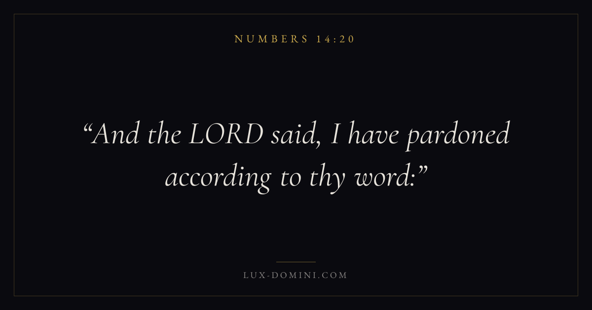 Books / Numbers / Chapter 14 / Verse 20 ← Numbers 14:19 Numbers 14:20 Numbers 14:21 → And the LORD said, I have pardoned according to thy word: Download verse card Share on Twitter Share on Facebook Pin it ✦ Key themes HopePrayerJustice and mercyForgivenessPilgrimage Read with Numbers 14:21Romans 8:24Revelation 21:4Matthew 6:9 Related topics Bible verses about hopeBible verses about prayerBible verses about justice and mercyBible verses about forgiveness ✦ Numbers Chapter 14 verses V. 1 V. 2 V. 3 V. 4 V. 5 V. 6 V. 7 V. 8 V. 9 V. 10 V. 11 V. 12 V. 13 V. 14 V. 15 V. 16 V. 17 V. 18 V. 19 V. 20 V. 21 V. 22 V. 23 V. 24 V. 25 V. 26 V. 27 V. 28 V. 29 V. 30 V. 31 V. 32 V. 33 V. 34 V. 35 V. 36 V. 37 V. 38 V. 39 V. 40 V. 41 V. 42 V. 43 V. 44 V. 45