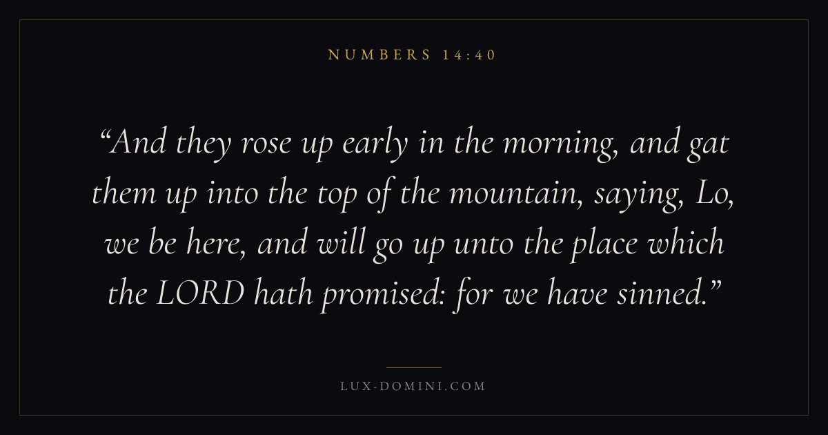 And they rose up early in the morning, and gat them up into the top of the mountain, saying, Lo, we be here, and will go up unto the place which the LORD hath promised: for we have sinned.