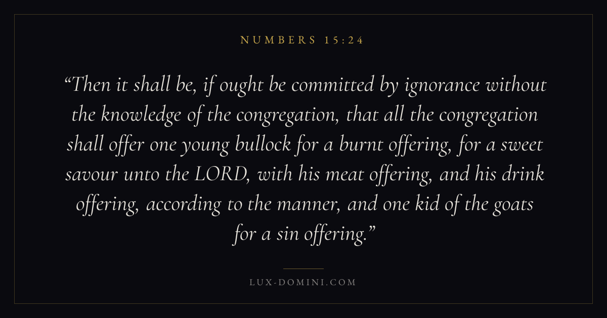 Then it shall be, if ought be committed by ignorance without the knowledge of the congregation, that all the congregation shall offer one young bullock for a burnt offering, for a sweet savour unto the LORD, with his meat offering, and his drink offering, according to the manner, and one kid of the goats for a sin offering.