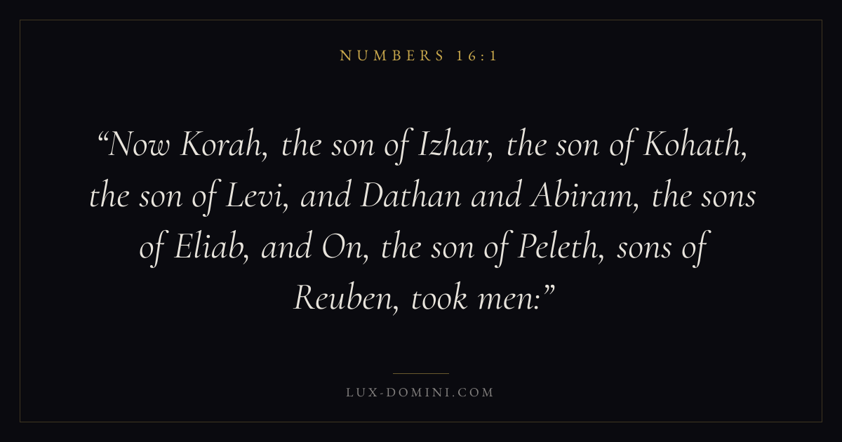 Now Korah, the son of Izhar, the son of Kohath, the son of Levi, and Dathan and Abiram, the sons of Eliab, and On, the son of Peleth, sons of Reuben, took men: