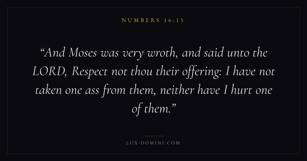 And Moses was very wroth, and said unto the LORD, Respect not thou their offering: I have not taken one ass from them, neither have I hurt one of them.