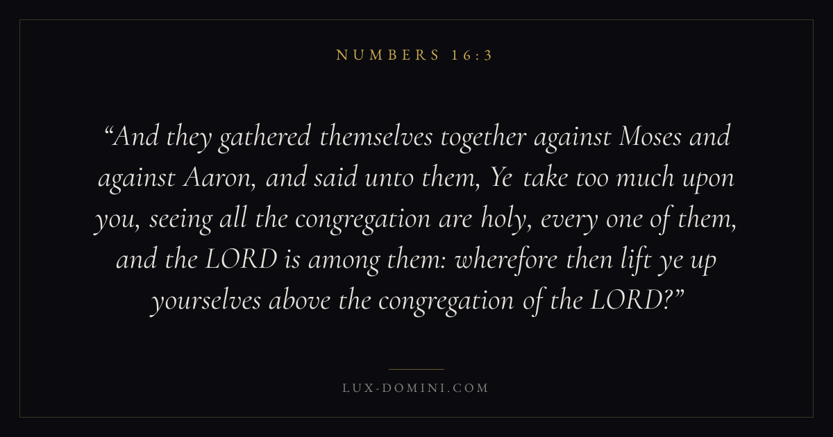 And they gathered themselves together against Moses and against Aaron, and said unto them, Ye take too much upon you, seeing all the congregation are holy, every one of them, and the LORD is among them: wherefore then lift ye up yourselves above the congregation of the LORD?