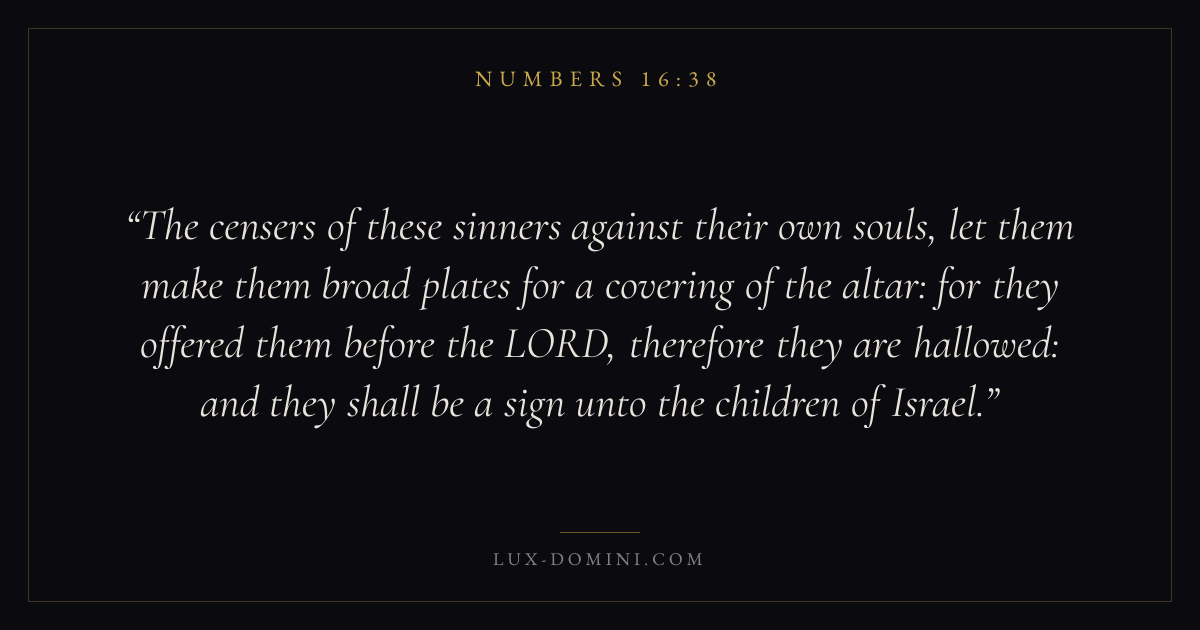 The censers of these sinners against their own souls, let them make them broad plates for a covering of the altar: for they offered them before the LORD, therefore they are hallowed: and they shall be a sign unto the children of Israel.