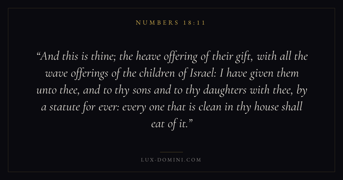 And this is thine; the heave offering of their gift, with all the wave offerings of the children of Israel: I have given them unto thee, and to thy sons and to thy daughters with thee, by a statute for ever: every one that is clean in thy house shall eat of it.