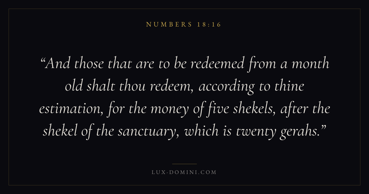 And those that are to be redeemed from a month old shalt thou redeem, according to thine estimation, for the money of five shekels, after the shekel of the sanctuary, which is twenty gerahs.