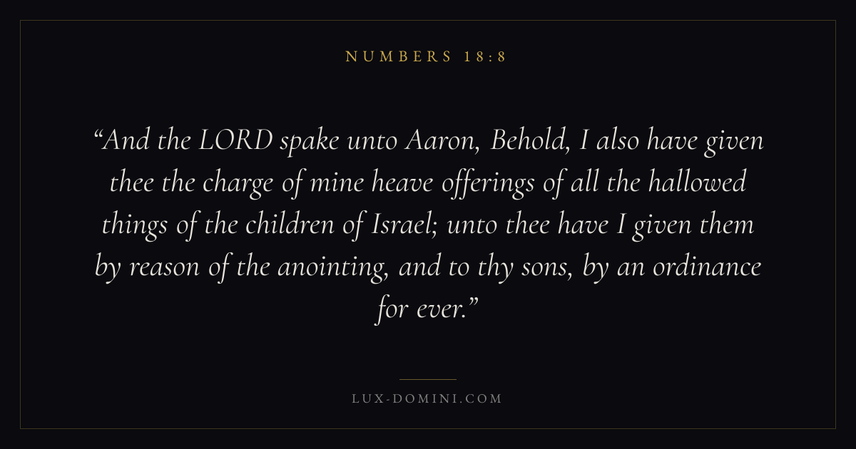 And the LORD spake unto Aaron, Behold, I also have given thee the charge of mine heave offerings of all the hallowed things of the children of Israel; unto thee have I given them by reason of the anointing, and to thy sons, by an ordinance for ever.