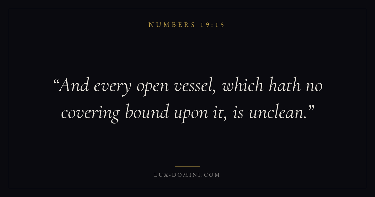 Books / Numbers / Chapter 19 / Verse 15 ← Numbers 19:14 Numbers 19:15 Numbers 19:16 → And every open vessel, which hath no covering bound upon it, is unclean. Download verse card Share on Twitter Share on Facebook Pin it ✦ Key themes Justice and mercyPilgrimageRebellionJudgment Read with Numbers 19:14Numbers 19:16Micah 6:8Amos 5:24 Related topics Bible verses about justice and mercy ✦ Numbers Chapter 19 verses V. 1 V. 2 V. 3 V. 4 V. 5 V. 6 V. 7 V. 8 V. 9 V. 10 V. 11 V. 12 V. 13 V. 14 V. 15 V. 16 V. 17 V. 18 V. 19 V. 20 V. 21 V. 22