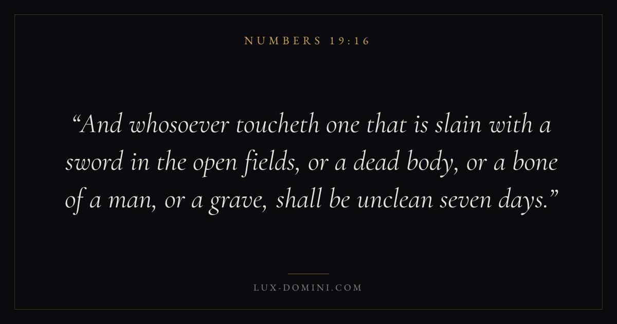 And whosoever toucheth one that is slain with a sword in the open fields, or a dead body, or a bone of a man, or a grave, shall be unclean seven days.