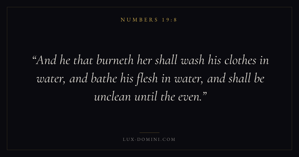 And he that burneth her shall wash his clothes in water, and bathe his flesh in water, and shall be unclean until the even.